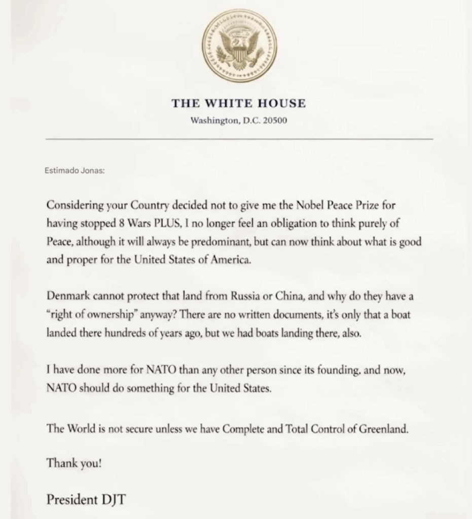 Un mensaje del presidente de Estados Unidos, Donald Trump, al primer ministro de Noruega, Jonas Gahr Stoere, elevó este lunes la tensión existente por la insistencia de la Casa Blanca en incorporar Groenlandia. En el texto, que circuló públicamente tras la filtración de Stoere a los medios, Trump vinculó su presión sobre la isla con no haber recibido el Premio Nobel de la Paz y sostuvo que ya no se sentía obligado a “pensar puramente en la paz”.